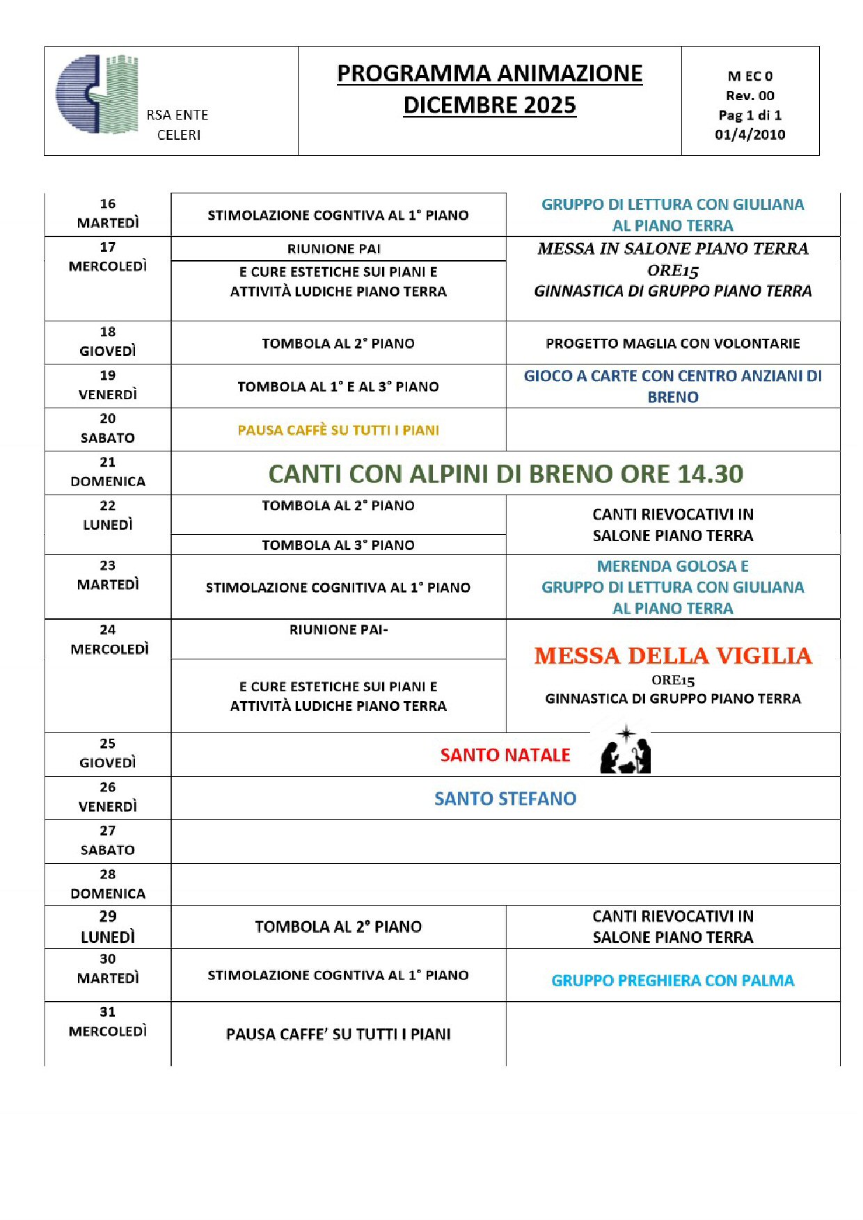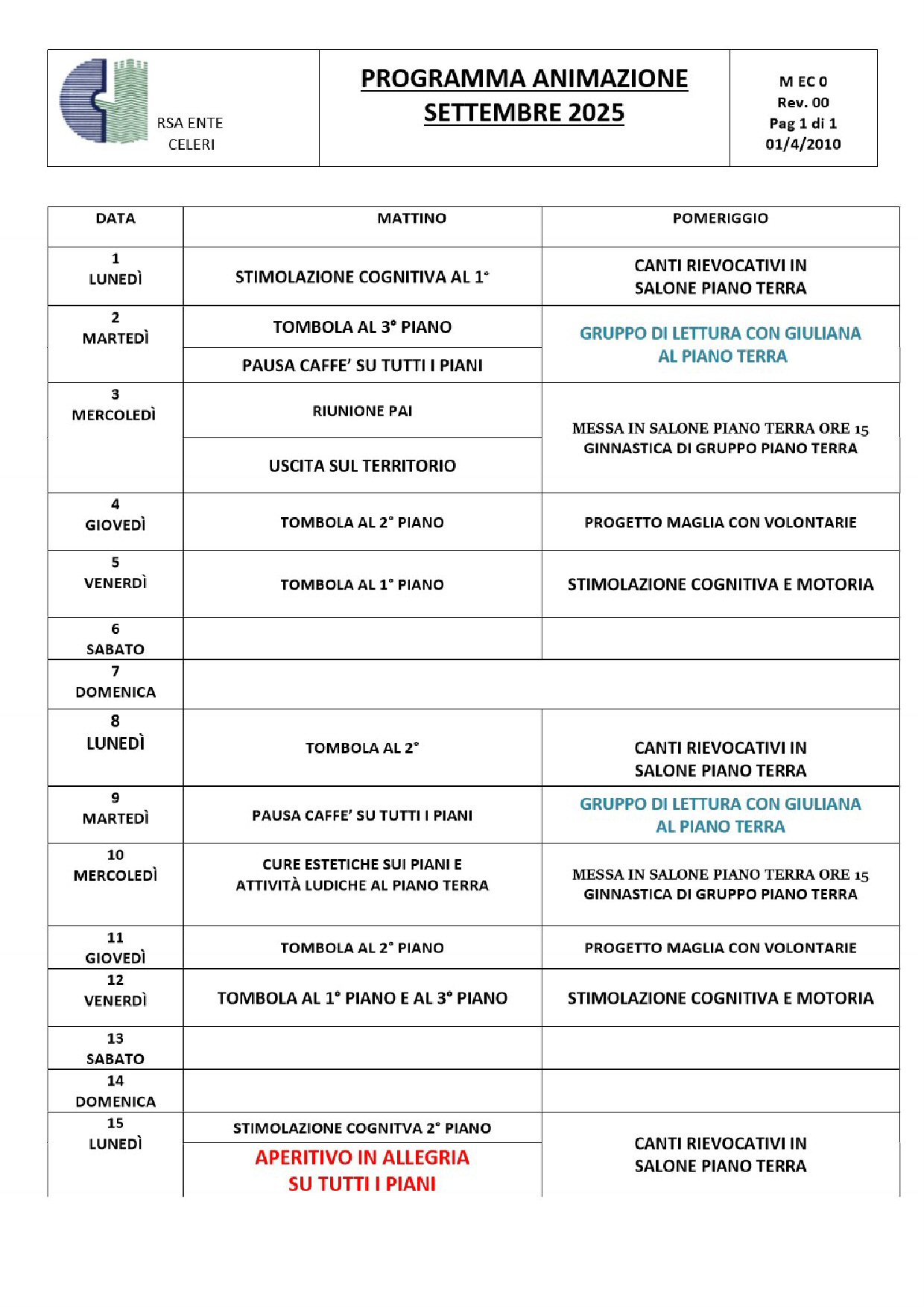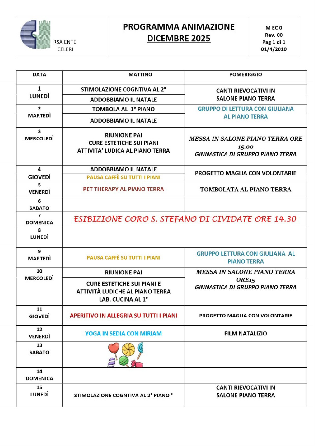 "Gioco della Tombola", "Canto in compagnia", "Pausa Caffè", "Attività manuali e cognitive", "Spazio bellezza" etc. si intervallano ai momenti conviviali e di festa che nascono durante il passare delle stagioni.