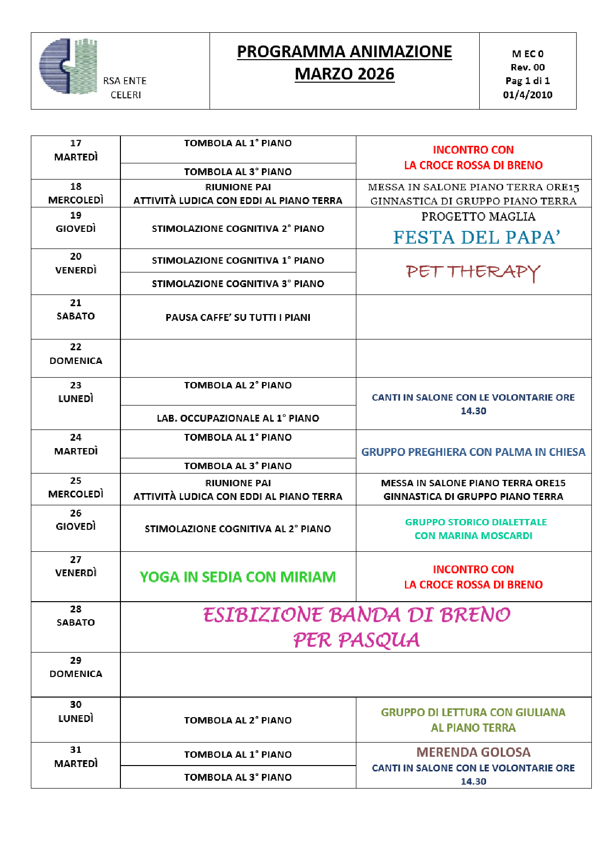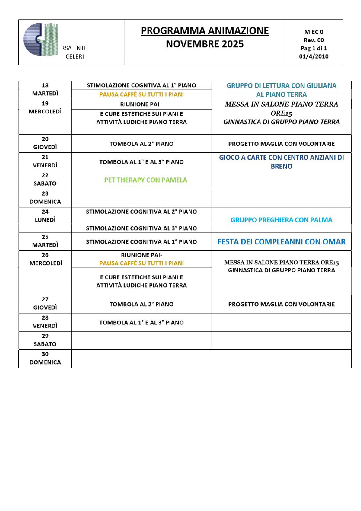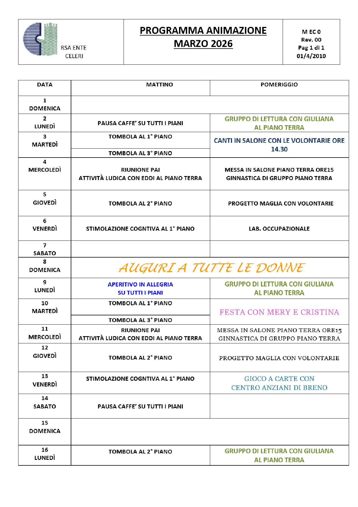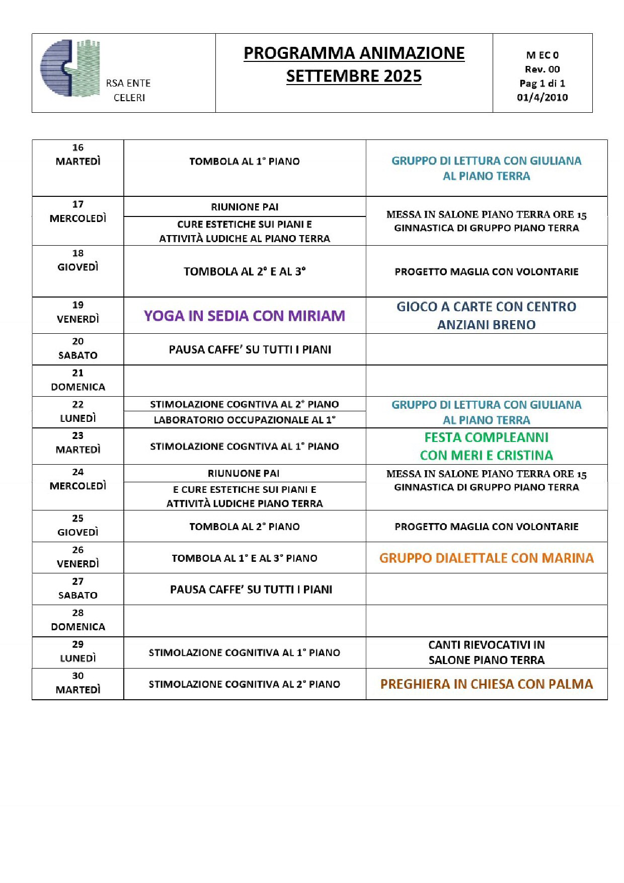 "Gioco della Tombola", "Canto in compagnia", "Pausa Caffè", "Attività manuali e cognitive", "Spazio bellezza" etc. si intervallano ai momenti conviviali e di festa che nascono durante il passare delle stagioni.